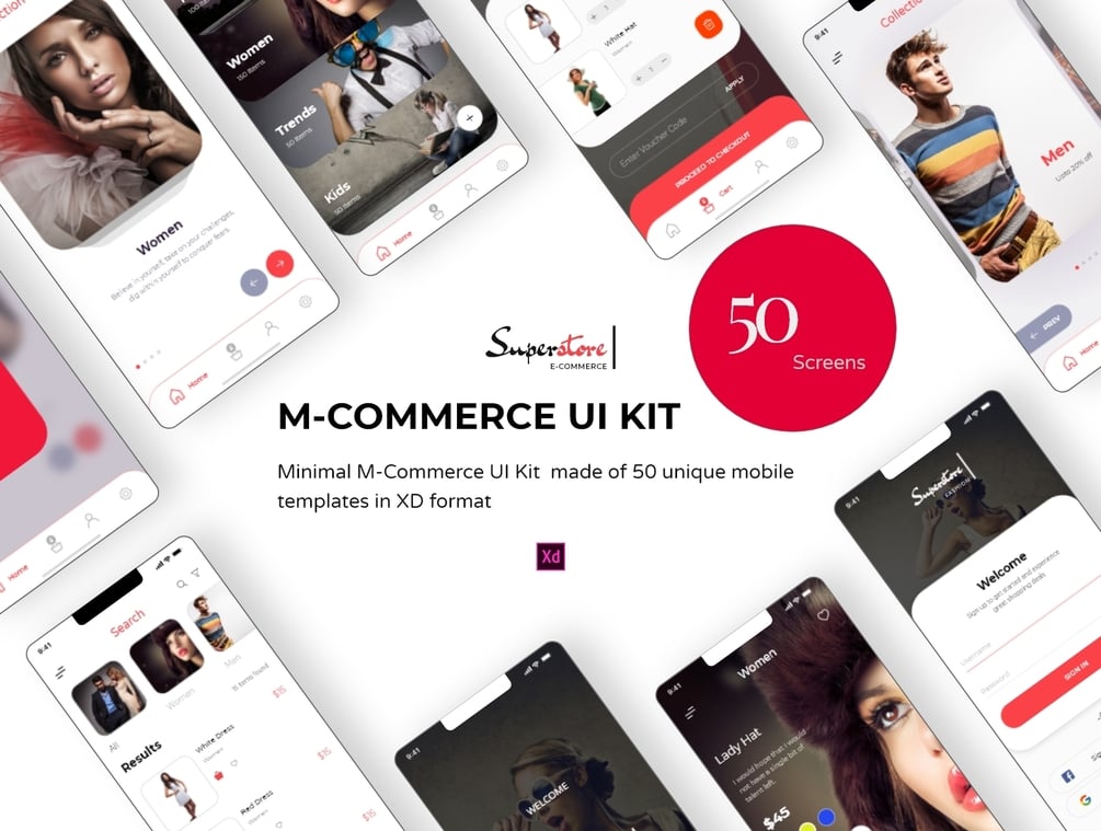 A minimal M-Commerce UI kit consisting of 50 app screens designed in Adobe XD.